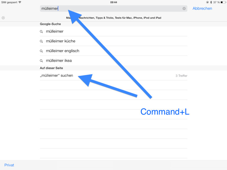 Springt in die URL-Bar zur Eingabe. Der Befehl kann zusätzlich die Suchfunktion auf der Website aktivieren: Dazu wählt man zum Beispiel auf maclife.de nochmals Command+L und tippt dann in der Adress-Leiste das Wort ein, das gesucht wird, beispielsweise „Mülleimer“ (die Eingabe nicht mit Enter bestätigen!). Safari bietet nun als Optionen „Googlesuche nach Mülleimer“ und „Mülleimer auf dieser Seite suchen“ an.