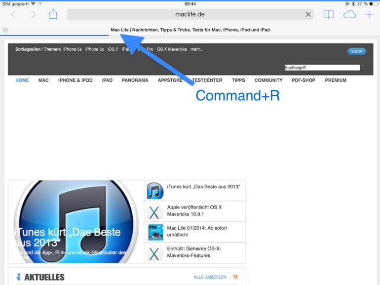Lädt den Tab neu. Mit der Eingabe Command+R forciert man das Neuladen der Seite, die man gerade sieht. Sind weitere Tabs im Hintergrund, werden diese nicht neugeladen.