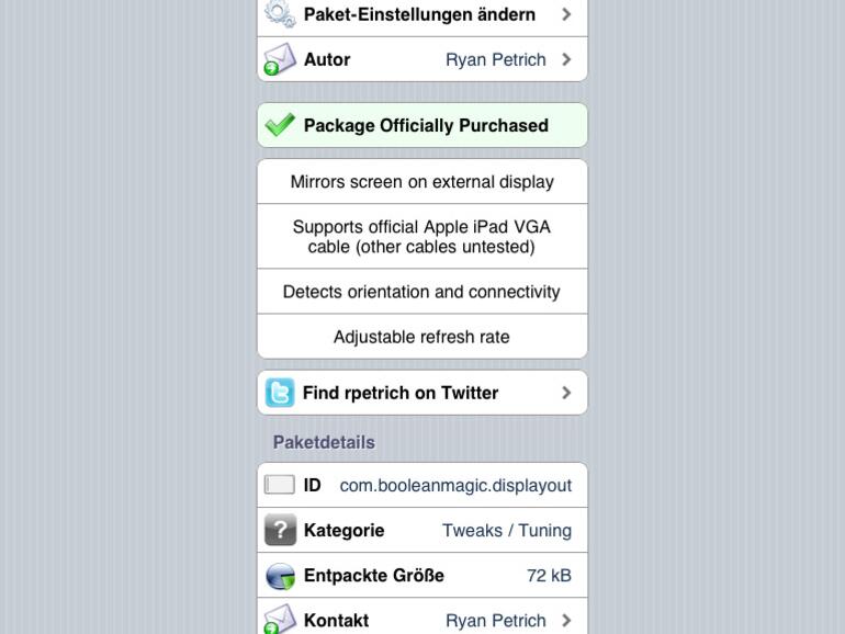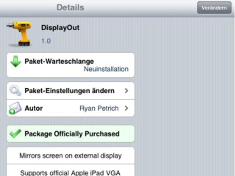 Ohne Jailbreak und installierter Display-Out-App können nur wenige Apps den VGA-Adapter sinnvoll nutzen. Eine 1:1 Ausgabe des Bildschirminhalts ist seitens Apple leider nicht vorgesehen. Wer eine iPad-App einem größeren Publikum vorführen möchte, ist deshalb mit Display Out gut bedient. Allerdings gibt es auch Einschränkungen: Performance-intensive Apps lassen sich nicht flüssig darstellen, Bildschirmvideos lassen sich zudem nur umständlich über einen VGA-Grabber aufnehmen. Randnotiz: Derzeit wird nur der original VGA-Adapter von Apple unterstützt. Beim Anschluss des Apple AV-Komponenten-Kabels bleibt der Bildschirm schwarz.
