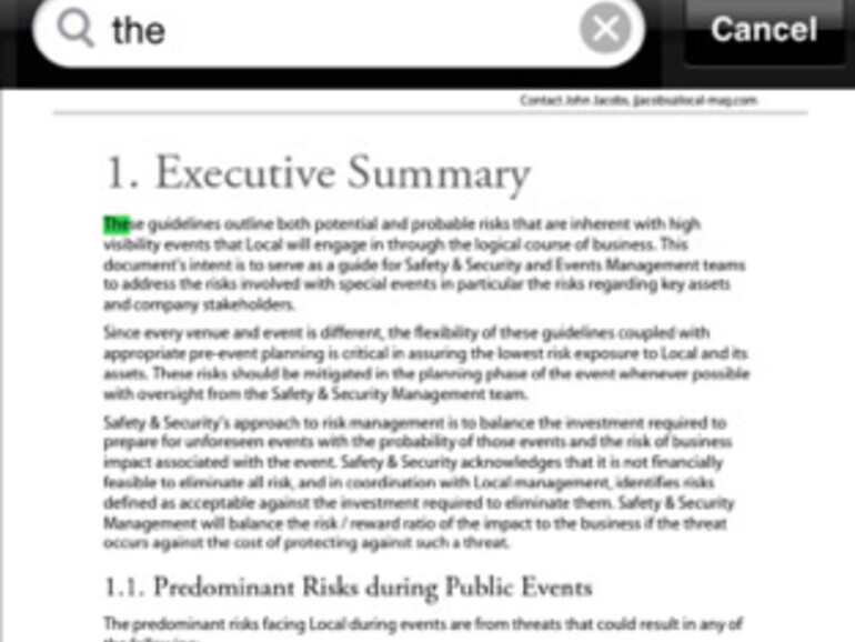 Adobe bevorzugt spartanische Apps - zumindest auf Smartphones und Tablets. Der Adobe Reader ist nicht mit der Desktop-Anwendung zu vergleichen, mit Ausnahme der PDF-Rendering-Engine. Dank diesem Softwareunterbau, welcher auch passwortgeschützte und verschlüsselte PDF-Dateien unterstützt, empfiehlt sich der offizielle Reader auch als Zweit-PDF-Viewer. Grenzen werden durch die Speicherausstattung des iOS-Geräts gesetzt, wobei es bei der App weniger auf die Größe des Dokuments, als die Anzahl der Seiten ankommt. Textsuche, AirPrint und „Öffnen mit“ werden unterstützt, Anmerkungen werden aber nur angezeigt und können nicht hinzugefügt werden.