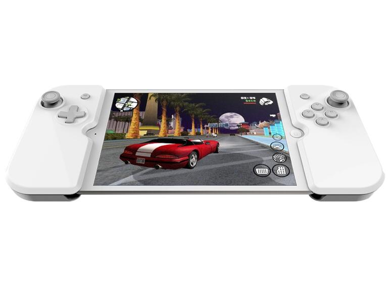 Wie einige iPhone-Controller umschließt Gamevice das Gerät und verteilt die Sticks und Tasten links und rechts vom Display. Auf der Rückseite gibt es noch vier Schultertasten. Optisch erinnert das Gamevice stark an Nintendos Controller für die Wii U. Vorteile dieser Controller-Form: Der Bildschirm ist näher am Gesicht und Spiele, die zusätzlich zu den Tasten auch noch auf Neigungssteuerung setzen, lassen sich weiterhin spielen. Nicht geeignet ist Gamevice hingegen für Spiele, die im Hochkant-Format laufen.
