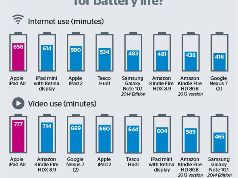 iPad Air und das iPad mini - beide sind die großen Gewinner im Testaufbau von Which. Das Vergleichsportal bescheinigt dem iPad Air beste Werte. Der iPad-Air-Akku ist ein Dauerläufer, kein anderer Hersteller schafft es in die Regionen der iPad-Leistung. Apple macht sich nur selbst Konkurrenz mit dem iPad mini Retina und dem iPad 2. Getestet wurden nur iPads, die Apple derzeit noch selbst im Verkauf hat.