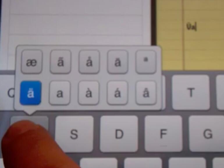 iFun zeigt ein Video, in dem zunächst das bekannte Aufrufen der Umlaute sowie des „ß“ demonstriert wird. Das iPad stellt zwar leider auch noch keine Option zum kompletten Wechsel des Tastatur-Layouts zur Verfügung. Dafür macht es dem Schreiberling die Arbeit aber insofern einfacher, als es nach kurzem Halten der gewünschten Taste automatisch den dazugehörigen Umlaut erscheinen lässt.