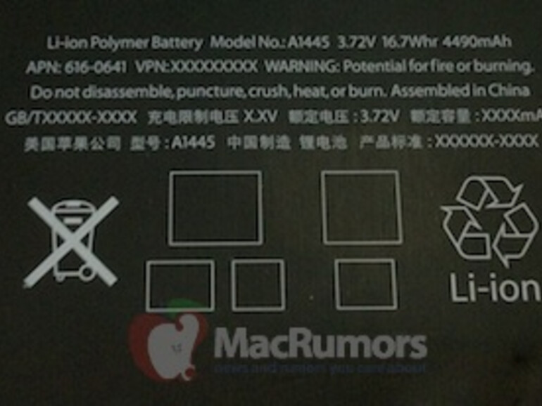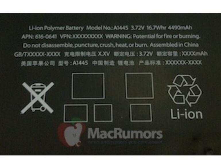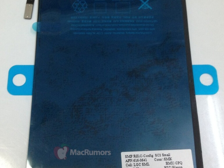 MacRumors hat Fotos von einem iPad-mini-Akku veröffentlicht. Das Teil trägt die Bezeichnung A1445 und die Teilenummer 616-0593. Die Leistung wird mit 3,72 Volt, 16,7 Wattstunden und 4490 Amperestunden angegeben. Auf der Rückseite sind noch Platzhalter zu sehen, die ein typisches Zeichen der Vorserienmodelle sind.