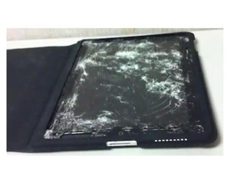 Doch erstaunlicherweise funktionierte der Home Button noch. Und siehe da, sogar der Touchscreen reagierte noch auf Gesten und der Beschleunigungssensor ebenfalls auf die Bewegungen des iPads. Allerdings sollte nur vorsichtig über das Display gewischt werden, um Schnittwunden zu vermeiden.