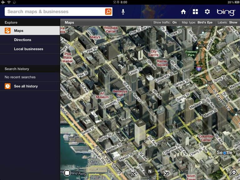 Die App bietet das von Bing bekannte große Hintergrundbild, hinzu kommen sechs kleine Widgets am unteren Bildschirmrand für Wetter, News, Karten, Filme, Trends und Börse. Suchanfragen können auch gesprochen werden. Bing sieht gut aus und nutzt die Auflösung des iPads, ohne überladen zu wirken. Die Trailer lassen sich natürlich alle auf dem iPad betrachten, die Wettervorhersage kann auf Celsius umgeschaltet werden.