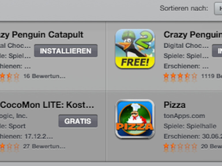 Bei Apps, die bereits gekauft wurden, steht statt dem Verkaufspreis nun der Text „Installieren”. Damit ist sofort klar, ob der Download einer App kostenlos ist oder nicht. Eine Übersicht der bereits gekauften Artikel wie im Mac App Store gibt es (noch) nicht.
