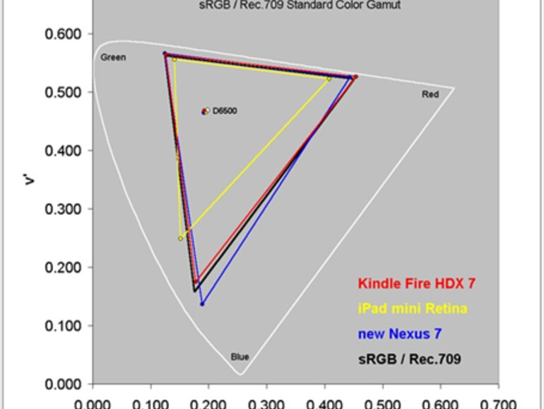 Das Retina iPad mini hat demnach den kleineren Farbraum. Verglichen mit Nexus 7 und Kindle Fire HDX ist das Display deutlich unterlegen.