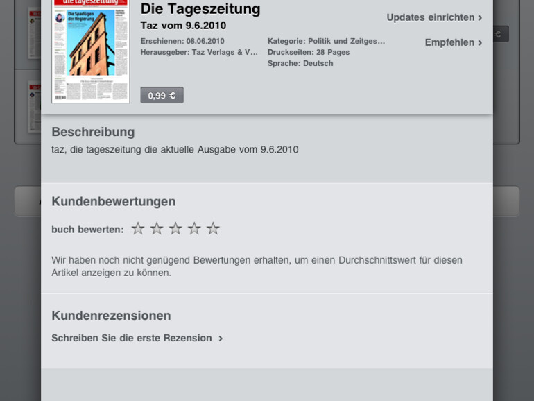 Etwas verwirrend ist die Auflistung der taz-Ausgaben im iBookstore: Das Datum wird nicht angezeigt, man muss die jeweils aktuelle Ausgabe deshalb mühsam suchen. Ein Blick in Apples Bücherladen zur besten Frühstückszeit & Zeitungszeit offenbarte zudem, dass der Verlag derzeit offensichtlich noch Probleme damit hat, die Zeitung tagesaktuell einzupflegen: Die Ausgabe vom 11. Juni war am späten Morgen noch immer nicht verfügbar. Nichtsdestotrotz zeigt das Angebot der taz, dass der iBookstore auch für den Vertrieb von Zeitungen und Magazinen genutzt werden kann. Vielleicht entdeckt ja auch Apple diesen Markt für sich und reicht in zukünftigen Versionen des iBookstores ein paar Funktionen nach, mit der sich Zeitungen besser sortieren und vielleicht sogar im Abo und via Push beziehen lassen: Dann klappt es auch mit der Frühstückszeitung auf dem iPad.