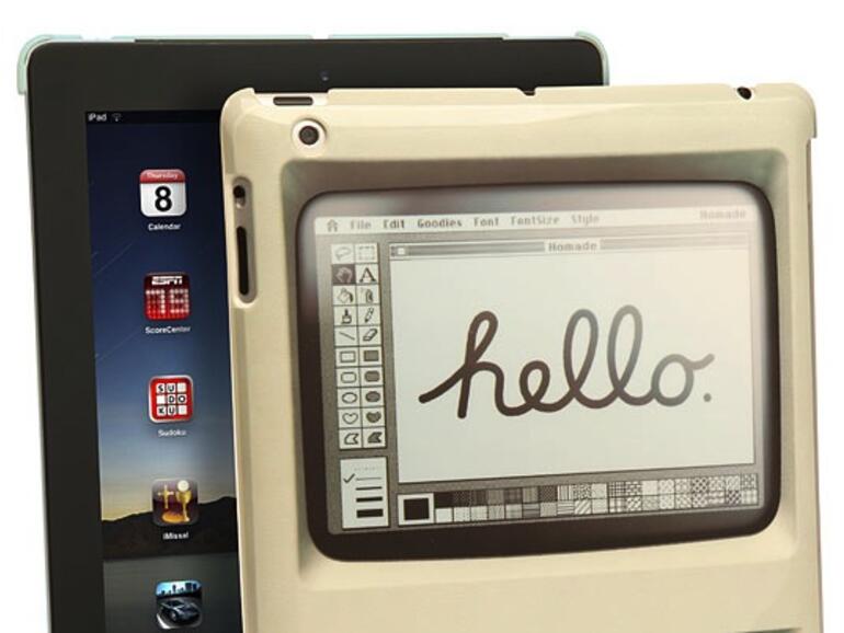Die Mac-Hülle zeigt das Malprogramm MacPaint, die 3,5-Zoll-Floppy ist natürlich nicht funktionsfähig. Wer Kenner des alten Macs aber wirklich überraschen will, der belässt es nicht bei dem 25 Dollar teurem Padintosh, sondern kompiliert sich gleich den Macintosh-Emulator vMac für das iPad, damit die Vorder- zur Rückseite passt.