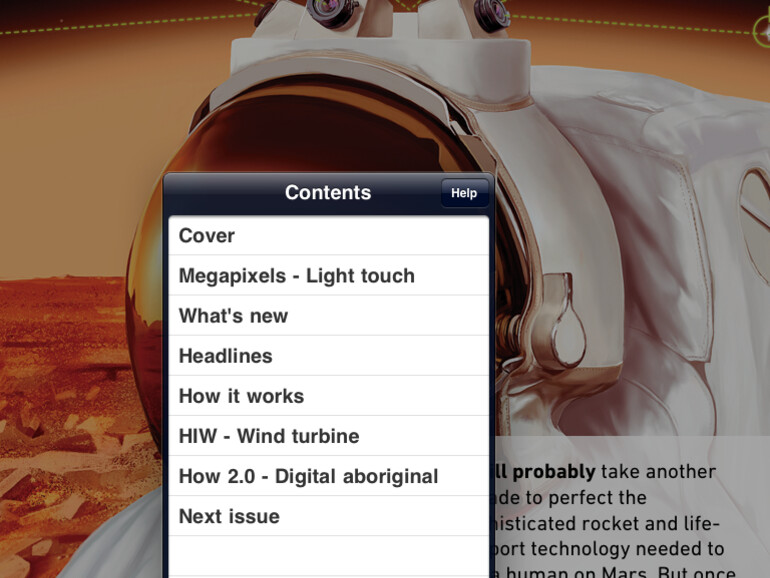 „Wow, das ist echt Sci-Fi“ – das waren die ersten Gedanken der Redakteure, die die iPad-Ausgabe des US-amerikanischen Magazins Popular Science in den Händen halten durften. Die Aufbereitung des populärwissenschaftlichen Magazins ist deutlich peppiger als im Falle Time- oder iKiosk-App: Bilder und Text werden in Ebenen dargestellt, der in Form von einspaltigem Text aufbereitete Artikel-Inhalt schwebt quasi über den bildschirmfüllenden Bildern. Blendet man den Text über eine Tipp-Bewegung auf die linke Bildschirmseite aus, lassen sich über vertikale Wischbewegungen weitere zu einem Artikel gehörende Bilder darstellen – über einen Tipp auf die rechte Seite des Bildschirms hingegen lässt sich wieder der hauptsächlich am rechten Bildschirmrand entlanglaufende Text einblenden. Sehr schick!