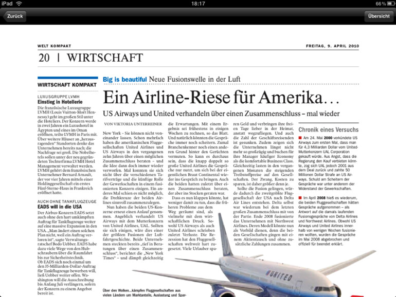 Den Weg des geringsten Widerstand beschreitet offensichtlich Axel Springer mit seiner iKiosk-App, in dessen schicken virtuellen iPad-Zeitungsständer sich derzeit Die Welt, Die Welt am Sonntag und die Welt Kompakt finden lassen. Ähnlich der Bild- und Welt-App für das iPhone, bietet die Springer-iPad-App lediglich PDFs der genannten Zeitungen und verzichtet gänzlich auf die Einbindung von Hyperlinks oder multimedialen Elementen. Das ist nicht unbedingt schlecht, denn die genannten Zeitungen fühlen sich im besten Sinne über weite Teile wie ihr Papier-Gegenstück an – will man aber beispielsweise zu einem spannenden Artikel auf Seite 21 springen, muss erst kräftig geblättert (beziehungsweise gewischt) werden, um den gewünschten Text lesen zu können. Bei einigen Bildern fällt bei starker Skalierung zudem die Datenkompression negativ auf.