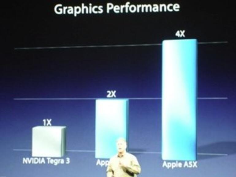 Wie Apple gestern während der Vorstellung des neuen iPads anhand eines einfachen Schaubildes klarmachen wollte, soll der eigene A5X-Prozessor tatsächlich eine vier Mal so hohe Grafikleistung haben wie der Tegra 3 von NVIDIA, der für neue Superphones entwickelt wurde. Benchmarks als Beleg für die Behauptung zeigte Apple nicht.