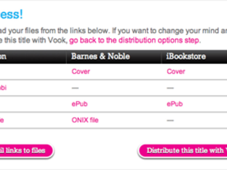 Einmal fertiggestellt, kann über Vook eine für Bücher benötigte ISBN-Nummer beantragt und das Werk über Apples iBookstore, BN.com und Amazon veröffentlicht werden. Neben der Erstellung und Distribution bietet Vook auch eine Möglichkeit, Statistiken und Verkaufszahlen anzuzeigen.