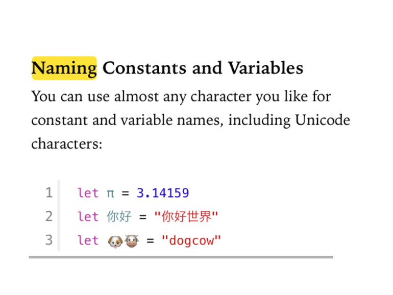 Letzteres ist allerdings nur ein Nebenprodukt der konsequenten Unicode-Verwendung: Apple weist im Abschnitt "Naming Constants and Variables" darauf hin, dass fast jedes Unicode-Zeichen für Konstanten und Variablen verwendet werden darf. Erlaubt sind also beispielsweise Umlaute und chinesische Schriftzeichen, aber auch Emoji, die durch den auf iOS und OS X vorinstallierten Apple-Emoji-Font farbig dargestellt werden. Swift sieht aber auch einige Einschränkungen vor: Mathematische Symbole, Pfeile und einige andere Zeichen sind nicht erlaubt, Variablennamen dürfen auch nicht mit einer Zahl beginnen.