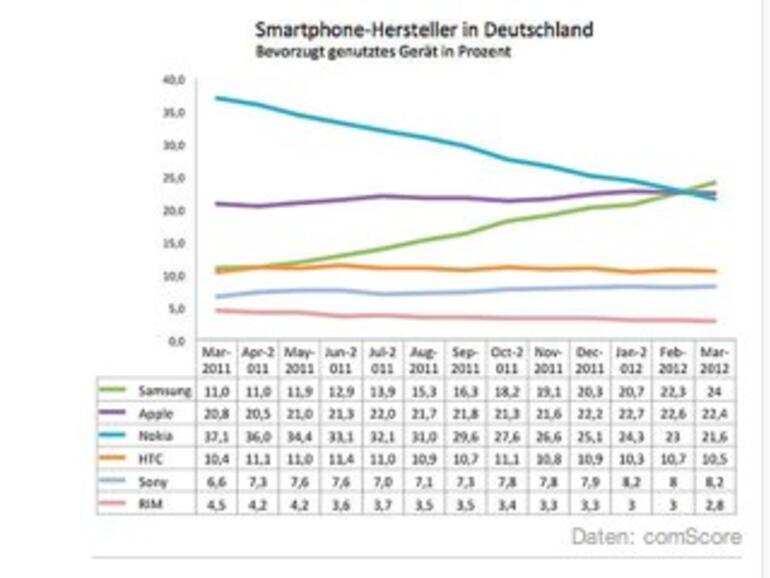 Immerhin noch 21,6 Prozent setzen auf ein Smartphone von Nokia. Im Dezember 2010 hatte der Marktanteil der Finnen noch bei satten 41 Prozent gelegen. Nur jeder zehnte Smartphone-Nutzer hat ein Modell von HTC, weit abgeschlagen auch die Hersteller Sony und RIM.
