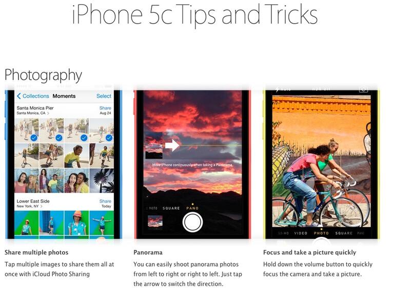 Die Einsteiger-Tipps beschäftigen sich unter anderen mit den Bereichen Fotografie, Swipe-Gesten, FaceTime, Maps, Siri und Musik. Aktuell sind die Sonderseiten nur über apple.com zu finden: