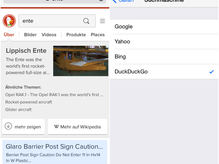 DuckDuckGo ist nach Google, Yahoo und Bing die vierte von Mobile Safari unterstützte Suchmaschine. Geld dürfte dafür kaum geflossen sein, denn es ist allein der Status der voreingestellten Suchmaschine, der zählt: Google soll pro Jahr eine Milliarde US-Dollar an Apple überweisen, wohlwissend, dass die meisten iOS-Nutzer die Suchmaschine nie ändern werden. Angeblich möchte Yahoo Google den Platz streitig machen und bereitet eine überarbeitete mobile Suche und ein besonderes Angebot an Apple vor, in iOS 8 bleibt es aber offenbar bei Google.