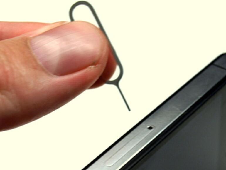 Die SIM-Karte des Anwenders ist an den Vertrag mit seinem Mobilfunk-Anbieter gebunden. Selbst wenn sie in weiser Voraussicht schon deaktiviert wurde, sollte man sie aus dem iPhone entfernen. Dazu drückt man zum Beispiel eine aufgebogene Büroklammer oder Apples SIM-Karten-Entferner in das kleine Loch am Karten-Schlitten, der daraufhin die SIM-Karte freigibt und leer wieder eingeführt werden kann.