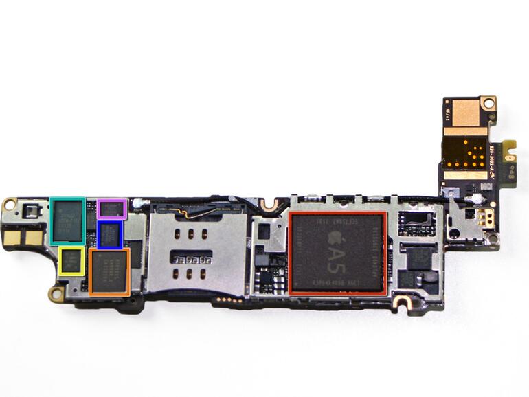 Auf der Hauptplatine identifiziert iFixit unschwer die A5-CPU, den Qualcomm-Mobilfunk-Chip (orange) und mehrere Verstärker. Anhand der Beschriftung des A5 sind die 512 MB RAM des iPhone 4S jetzt auch Bauteil-seitig bestätigt.