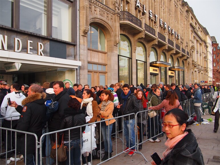 Also bei in der Kleinstadt, war garnichts los. Im MediaM waren sogar 5Geräte zum kaufen die noch keine Kunden hatten. Wollte mir in nächster Zeit ein Iphone 5 kaufen, aber ich hatte es heute in der Hand. Ich behalte doch mein 4s. Wechseln lohnt sich nicht.