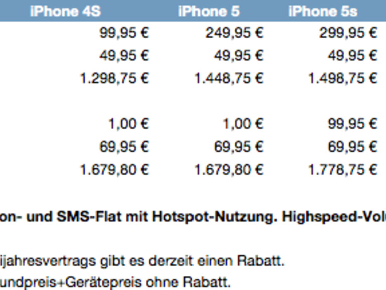 Das 5c gibt es laut Informationen von Teltarif mit 16 GB ab 29,95 Euro - wenn Kunden einen Zwei-Jahres-Vertrag im Tarif Complete Comfort L abschließen, der 69,95 Euro monatlich kostet. Enthalten ist LTE-Mobilfunk, damit sich Kunden noch schneller durch das enthaltene Datenvolumen von 1 GB surfen können. Für Telefon, SMS und die Hotspots gilt eine Flatrate. Wer lieber den günstigeren Complete Comfort M wählt, zahlt zwanzig Euro weniger, hat 750 MB Datenvolumen und LTE, muss für das kleinste 5c aber dafür 229,95 Euro bezahlen.