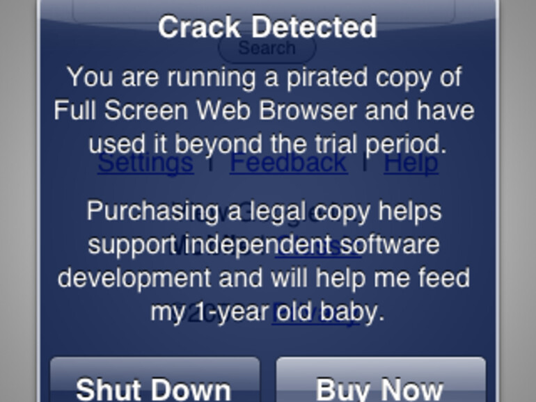 Chatelain schreibt in seinem Blog-Eintrag, dass er erst über unschöne Gegenmaßnahmen wie das sofortige Beenden der App oder einen Selbstzerstörungsmechanismus nachgedacht habe, sich aber dann für das Zurückschalten auf eine Demo-Version entschied. Dem Software-Piraten bleiben nun zehn Programmstarts, bevor das Programm nicht mehr arbeitet. Er kann aber auch das Programm direkt aus dem angezeigten Dialogfeld heraus erwerben - bei einem Preis von 0,79 Euro sicher die einfachste Variante.