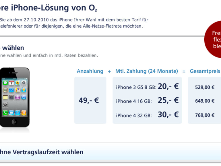 Neu in der Vermarktung des iPhone sind die O2 Blue Flex-Tarife und der als „O2 o“ bezeichnete Tarif, weil diese ohne Vertragslaufzeit ausgestattet sind. In allen Tarifen befindet sich aber eine Drosselung nach 300 MB Datenvolumen. Monatlich sind zwischen 10 Euro bis 60 Euro im Tarif O2 o möglich, beziehungsweise innerhalb der Minuten-Kontingente in den Tarifen O2 Blue 100 Flex und Blue 250 Flex entweder 20 Euro oder 35 Euro monatlich. In diesen drei Tarifen sind alle iPhone-Modelle mit einer 24-monatigen Finanzierung erhältich. Inklusive der Anzahlung kostet das iPhone 3Gs 8GB 529 Euro, das iPhone 4 16 GB kommt auf 649 Euro und für das iPhone 4 32 GB sind 769 Euro zu entrichten. Finanzierung und Telefonie summieren sich somit auf monatliche Zahlungen von 30 Euro bis 95 Euro. Selbstständige und Freiberufler sowie Schüler erhalten besondere Konditionen. Als Besonderheit wird das iPhone ohne SIM-Lock ausgeliefert. Alle Tarife stehen bei o2online.de. Ein umfangreiches FAQ bietet weiteren Service.