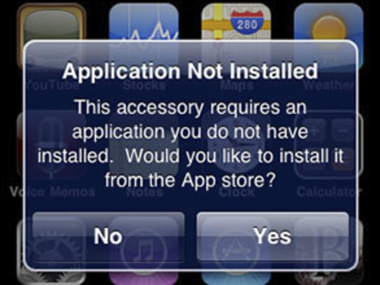 Nach der Verbindung mit dem Dock-Anschluss fragt das System den Benutzer, ob es die Betriebs-Software für das neue Zubehörteil aus dem App Store beziehen soll. Wird dies bejaht, gerät der gewohnte Prozess in Gang, den man etwa aus Verlinkungen in Gratis-Apps auf die kostenpflichtige Version kennt - ein Klick führt auf die entsprechende Produkt-Seite. Diese Möglichkeit bestehe allerdings nur für Peripherie, die von Apple für iPhone und iPod touch zertifiziert wurde. Getestet wurde das Ganze von iLounge anhand des iTrip-FM-Senders und der dazugehörigen Applikation.