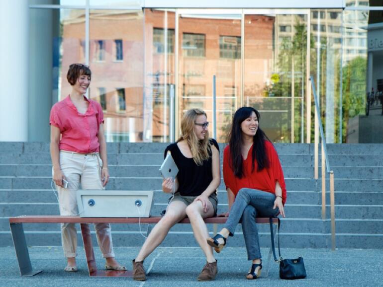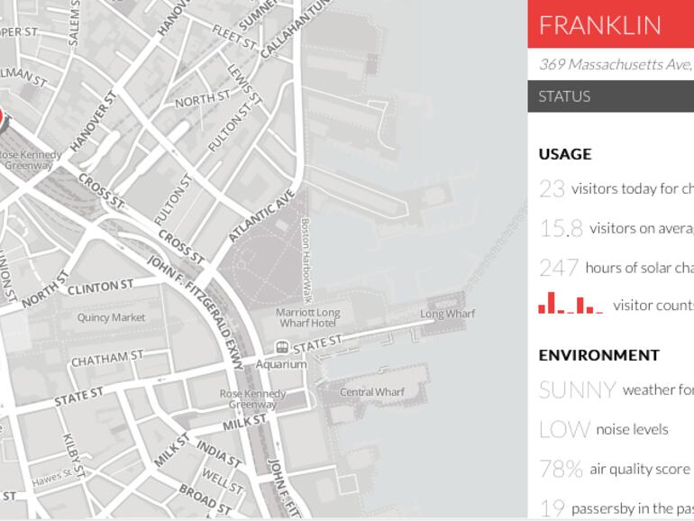 Jutta Friedrichs, Sandra Richter und Nan Zhao werben derzeit für ihr „Soofa“ (Smart Urban Furniture), dessen technischer Aufsatz nicht nur die Schnittstelle Sonne-zu-USB sondern auch Lärm- und Luftsensoren bietet. Wo es gerade ruhig und die Luft frisch ist, kann daher zentral über die Website des Startups ebenso eingesehen werden wie die tägliche und durchschnittliche Nutzung der bereits in Betrieb genommenen Installationen.