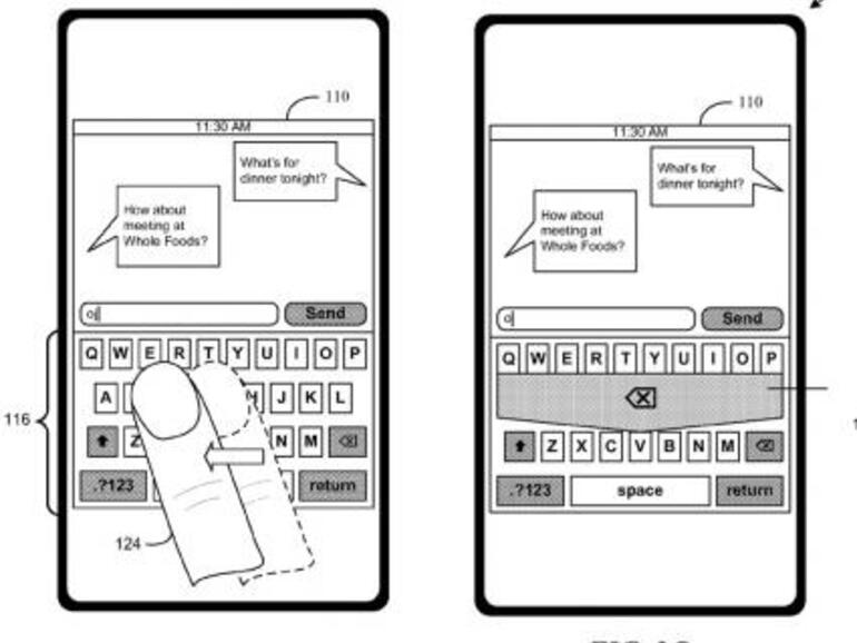 "Da die Leer- und Rückschritttasten sehr häufig verwendet werden", bemerkt Apple im neuesten iPhone-Patentantrag, seien sie ideale Kandidaten für eine vereinfachende Bedienung mittels Gestensteuerung. Den letzten Buchstaben löschen? Eine Wischbewegung nach links macht's möglich. Leertaste? Einmal nach rechts wischen: "Wischbewegungen nach links und rechts ergeben intuitiv die zugehörige Cursor-Bewegung, welche die regulären Tasten repräsentieren."