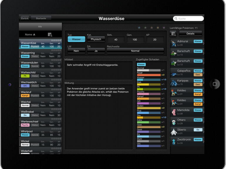 Die Pokémon-Informationen gibt es in sechs Sprachen, es gibt eine Suchfunktion für Namen, Eigenschaften und Typ. Zu jedem Pokémon kann der Spieler sich Notizen machen. Für 1,79 Euro gibt es die Pokémon aus der Einall-Region (Nummer 494 bis 647), vervollständigt wird der Index per In-App-Kauf mit vier Paketen zu je 5,49 Euro. Damit liegt der Preis für den Gesamt-Index über dem des Pokédex für den Nintendo 3DS (Pokédex 3D Pro).