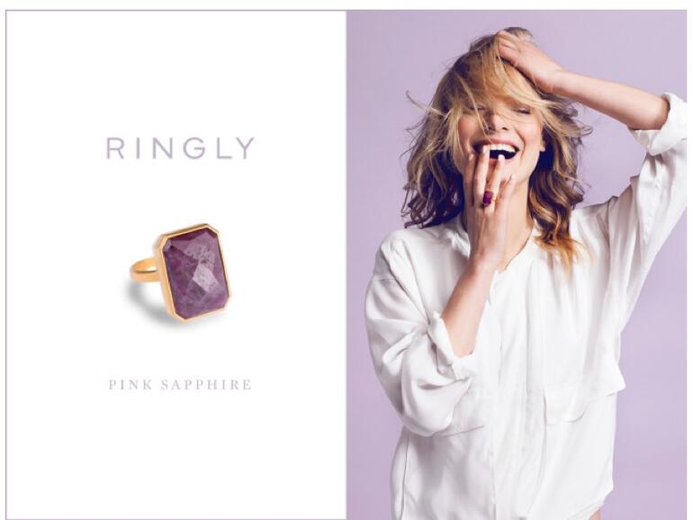 Ringly ist aus 18 Karat Gold und ist in Versionen mit den Halbedelsteinen Schwarzer Onyx, Smaragd, Rosa Saphir oder Mondstein in den Größen 6, 7 und 8 erhältlich.