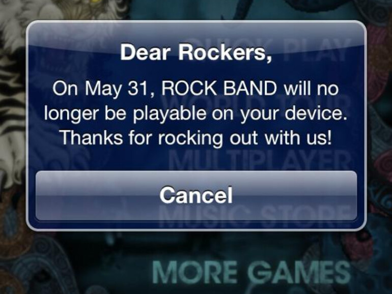 Update: Inzwischen hat sich EA geäußert: Die Nachricht, die Rock-Band-Spieler erhalten haben, sei versehentlich geschickt worden. Rock Band werde auch weiterhin spielbar sein, zumindest im Einspieler-Modus. Ob es sich wirklich um einen Fehler, oder einen Rückzieher handelt, ist offen. Technisch wäre es aber bei einem Spiel, welches kein reiner Offline-Titel ist, schwierig, es zu deaktivieren.