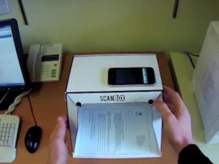 Scanbox ist eine zusammenfaltbare kleine Kiste mit einem Guckloch für die Kamera des Smartphones. Das Smartphone kann während der Aufnahme auf der Box liegenbleiben, bei mehreren Aufnahmen hintereinander sollte also die Qualität gleich bleiben. In der Plus-Variante besitzt die Scanbox eigene LED-Lichter, während die Standard-Version vollständig vom Umgebungslicht abhängig ist. Zusammengehalten wird die Box über Magneten.