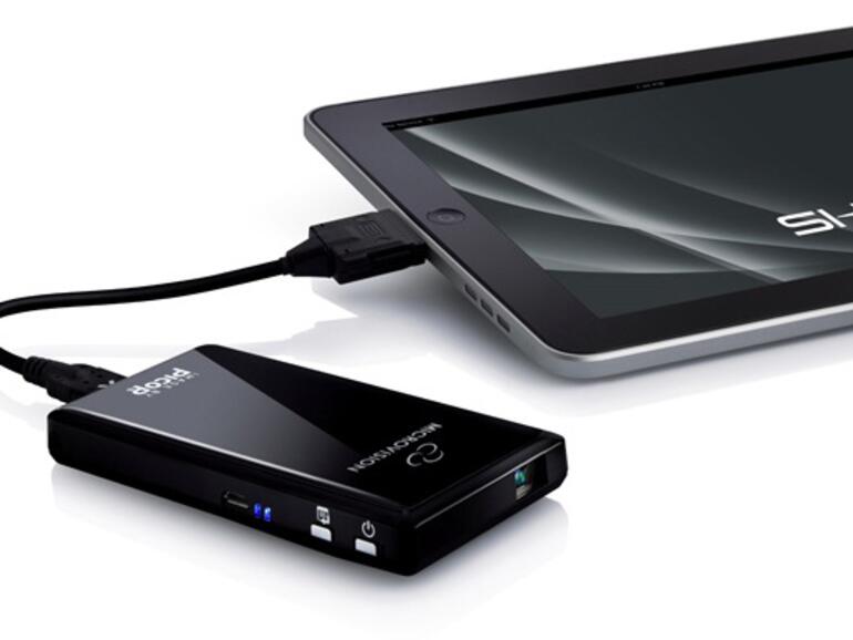 Bei Laserbeamern werden Bilder Punkt für Punkt mittels Laserstrahl auf die Leinwand projiziert. Gegenüber herkömmlichen Beamer-Technologien hat das den Vorteil, dass das Bild nicht fokussiert werden muss, also immer scharf ist – unabhängig von Untergrund und Abstand zur Projiektionsfläche. Zudem weisen Laserbeamer einen sehr hohen Kontrast auf, der SHOWWX+ soll einen Kontrast von 5000:1 bei einer Helligkeit von 15 ANSI-Lumen erreichen. Die Auflösung von 848 x 480 Pixeln liegt allerdings noch unter der von iPhone 4 oder iPad. Mit 450 Euro ist der Mini-Beamer allerdings auch nicht ganz billig.
