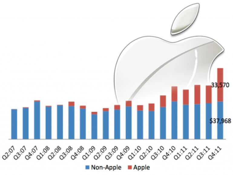 Apples Stärke liegt vor allem in den hohen Gewinnmargen des iPhones und iPads. So machte Apples Gewinn vor Zinsen und Steuern im vierten Quartal 2011 80,5 Prozent des Gesamtgewinns der Mobilrechner-Industrie aus. War Nokia im dritten Quartal 2008 mit 54,3 Prozent Anteil am Gesamtgewinn noch der Platzhirsch, ist der Anteil des finnischen Handy-Herstellers inzwischen auf magere 1,9 Prozent gesunken.