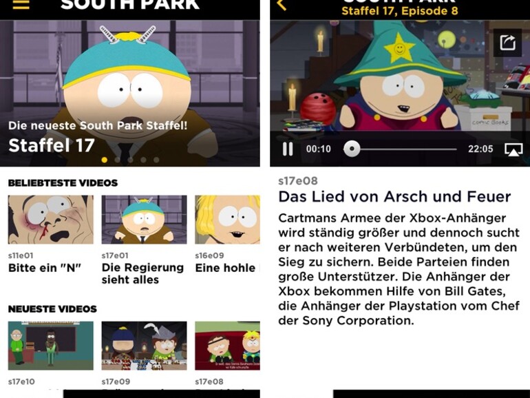Zwar lässt sich South Park bereits seit längerer Zeit via www.southpark.de offiziell, legal und kostenlos streamen, doch das Webangebot setzt Flash voraus und schließt iOS somit aus. Die von MTV veröffentlichte South-Park-App ermöglicht nun auch iOS-Anwendern den Gratis-Zugriff auf nahezu alle bisher produzierten Folgen der bekannten Comedy-Serie für Erwachsene. Lobenswert: Der Stream lässt sich via AirPlay beispielsweise an ein Apple TV durchreichen, zudem erlaubt die App die Wahl zwischen der englischsprachigen Original- und der deutschen Synchronfassung.