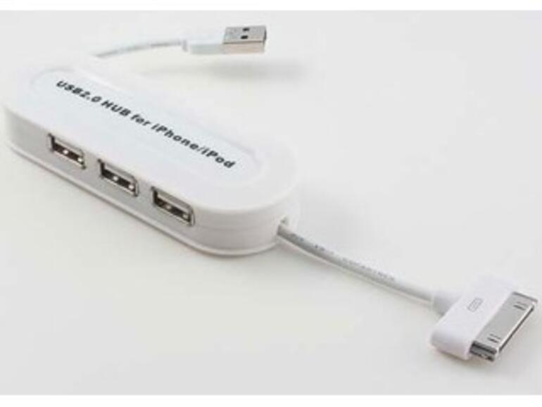 Beim 3-Port USB Hub handelt es sich um ein iPod-Dock-Kabel, das von einem USB-Hub gespleißt wird. Der 30-pin Dock-Anschluss unterstützt HotSynch zum Datenabgleich und die Aufladefunktion für alle iPhones und den iPod touch, den iPod classic sowie die iPod nanos der vierten und fünften Generation. Dank der drei USB-Anschlüsse spielt es keine Rolle mehr, ob der iPod am Rechner während des Aufladens einen anderweitig benötigten USB-Anschluss blockiert.