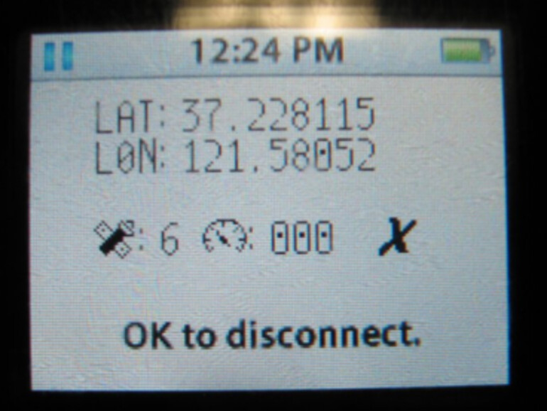Eine nette Bastelei ist Ben Kokes gelungen: Er hat einen GPS-Empfänger für den iPod nano 1G gebastelt und lässt die aktuellen Geopositionsdaten auf dem iPod-Display anzeigen. Er nutzt dazu den AiR-Modus, der es erlaubt, ein Bild mit vier Farben an den iPod zu schicken. Seine Hardware muss also auch das Generieren dieser Grafik, sowie die Kommunikation mit dem Gerät übernehmen.