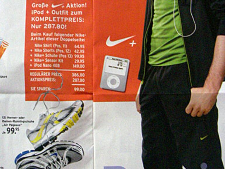 Für 287,80 Euro erhält man in diesem Aktionspaket nämlich nicht nur das Sportkit, den iPod nano (4 GB) und die passenden Schuhe des Modells "Air Pegasus" - auch eine Nike Short und ein passendes T-Shirt sind im Setpreis enthalten. Keine Angaben macht Karstadt in seinem Werbeprospekt allerdings darüber, wie lange das Angebot gültig ist. Und auch die Online-Bestellung des Pakets scheint nicht möglich zu sein - zumindest wurde das aktuelle Prospekt "Sport&Style" bislang nicht auf die Karstadt-Website gestellt.