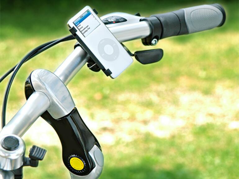 So preist Hama die Stangen-Halterung namens iBikeMount für den iPod nano an. Durch die iBikeMount-Halterung bleiben beide Hände am Lenker, das Display in Sichtweite und die Steuertasten gut erreichbar. Dazu wird der rückseitig angebrachte, hufeisenförmige und gummierte Haltering über Lenkerstangen mit Durchmessern von 22 bis 26 Millimeter geklemmt und via Spannverschluss, ähnlich dem älterer Schlüsselringe, verriegelt. Damit bleibt die schwarze Kunststoffhalterung vor Verrutschen gesichert und wieder abnehmbar. Laut Hama lässt sich der iPod-Halter auch an Kinderwagen, Rasenmähern oder ähnlichem anklemmen. Im Handel ist die Halterung für 39,99 Euro erhältlich.