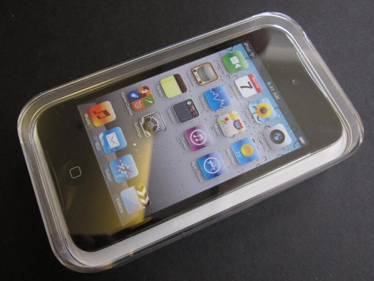 Die Bilder zeigen die glänzende Rückseite sowie Details der neuen FaceTime-Kamera an der Front des iPod touch. Wie auch beim shuffle ist die Verpackung des Geräts selbst schön knapp dimensioniert (iFixit zufolge war bei der Versand-Hülle eher das Gegenteil der Fall). Die schlanke Packung enthält die typischen Obst-Aufkleber, Ohrhörer sowie ein Synchronisations- und Ladekabel. Dazu eine Kurzanleitung mit dem ulkigen Namen „Finger Tips“.