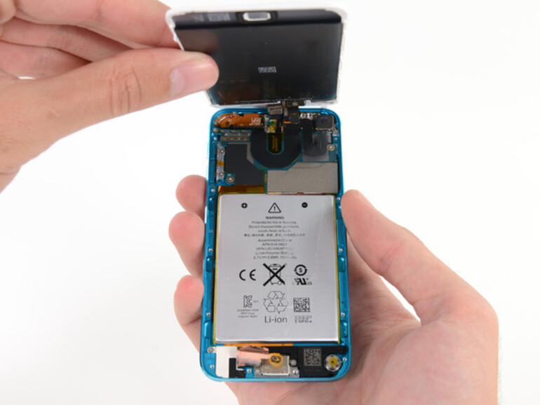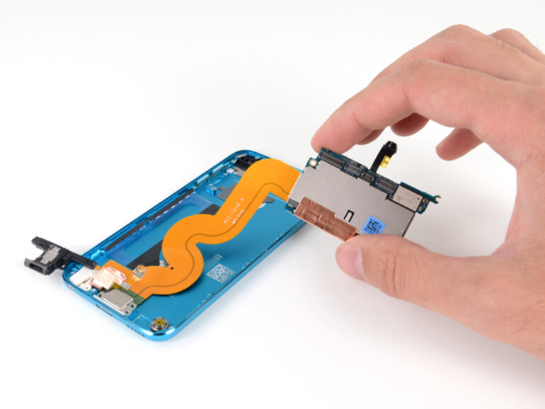 Weniger erfreulich am Akku ist hingegen dass dieser nicht nur mit dem Logic Board verlötet, sondern sogar im Gehäuse selbst festgeklebt wird. Auch ansonsten hat sich Apple Mühe gegeben, den iPod touch so reparier-unfreundlich wie möglich zu gestalten: Neben einer guten Ladung Leim halten auch mehrere Kunststoffclips das Gehäuse fest zusammen. Oder in Reparatur-Note von iFixit ausgedrückt: Ungenügend mit 3 von 10 Punkten. Ein weiteres Detail am Rande: Der auf eine Gummi-Membrane aufgesetzte Home-Button ist laut iFixit schwächer als der des iPhone 5.