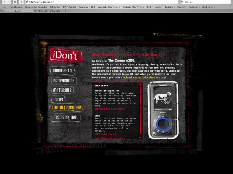 Auch und gerade für den überzeugten und humorvollen Mac- und iPod-Fan bietet idont allerdings Unterhaltsames. Unter der Rubrik "Propaganda" finden sich zum Beispiel einige Links zu Seiten wie www.theroyalwe.com oder www.cyberrodent.com, die mit ihren Parodien durchaus zu unterhalten wissen.