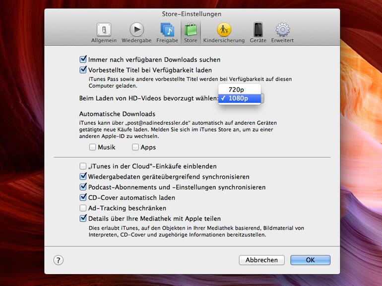 Bislang waren nur vereinzelnd Titel in 1080p zu haben, der Großteil war in 720p hinterlegt. Die Anzeige mit der höheren Einstellung lässt sich über iTunes am Mac oder auf dem Apple TV einsehen. Wer die hohe Auflösung als Standard nutzen möchte, kann seine Grundeinstellungen entsprechend ändern. In iTunes findet man dieVorgabe in den Store/Einstellung (cmd,) / Store / Beim laden von HD-Videos bevorzugt wählen. Der Nutzer hat weiterhin die Möglichkeit, auch niedrigere Auflösungen zu wählen. Der Wechsel zwischen SD und HD und dort zwischen 720p und 1080p ist jederzeit möglich.