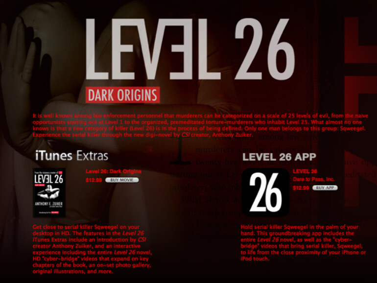 Mit diesem Killer bekommen es Steve Dark und sein Team in dem digitalen Roman "Level 26" zu tun. Die iPhone-Anwendung ist ein eBook mit drei- bis fünfminütigen Filmsequenzen, die den Übergang von einem Kapitel zum nächsten bilden. Für die Filmszenen wurden erfahrene Schauspieler aus der zweiten Reihe verpflichtet, darunter Michael Ironside und Bill Duke. Zwanzig dieser "Video-Brücken" gibt es, hinzu kommen noch ebensoviele Zeichnungen von Marc Ecko.