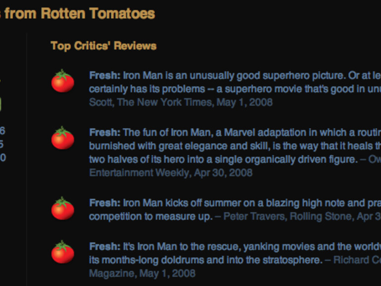 Zwar darf auf Rotten Tomatoes jeder schreiben, aber es interessiert natürlich nur die Meinung von Profis: Die Website fasst die Eindrücke verschiedener Filmkritiker zusammen. Je höher der Tomatometer, desto besser hat ein Film bei der Kritik abgeschnitten. Ein positiver Artikel gilt als „frisch” (fresh) und ein negativer als „verfault” (rotten). iTunes zeigt die vier Top-Rezensionen, die Kundenbewertungen und -rezensionen erscheinen darunter.