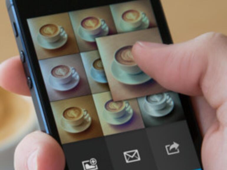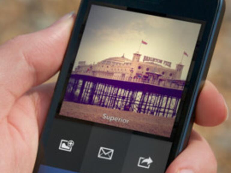 Im Anschluss an die Fotosession kann aus einer Auswahl von acht Filtern ein passender Effekt gewählt werden. Klar, dass eine Option zum Teilen des Werks via Twitter oder Facebook nicht fehlt.