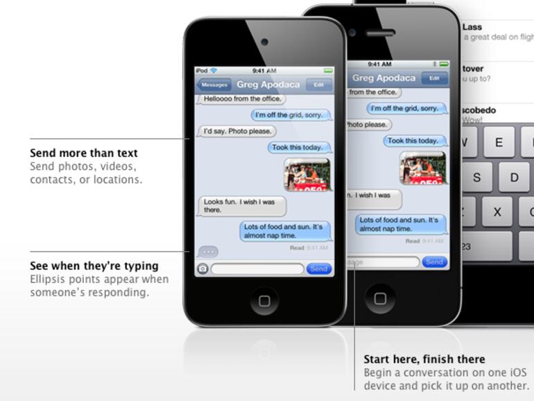 iMessage erlaubt den Versand von Text, Fotos, Video, Ortsdaten und Kontakten über WiFi und(!) Mobilfunk-Netze. Der Dienst bietet Funktionen wie Empfangs- und Lesebestätigungen, Daten-Verschlüsselung und fortgeführte Konversationen trotz Gerätewechsel. iMessage wird sogar in die bestehende App „Nachrichten“ integriert.